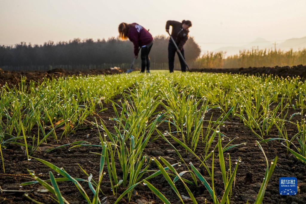 10月11日,河北省遵化市新店子鎮農民在麥田勞作。