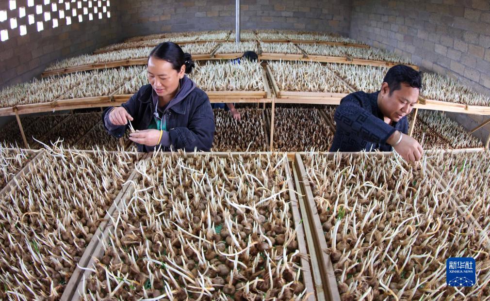 10月11日,在貴州省銅仁市玉屏侗族自治縣朱家場鎮混寨村西紅花種植基地,村民在給西紅花苗抹芽。