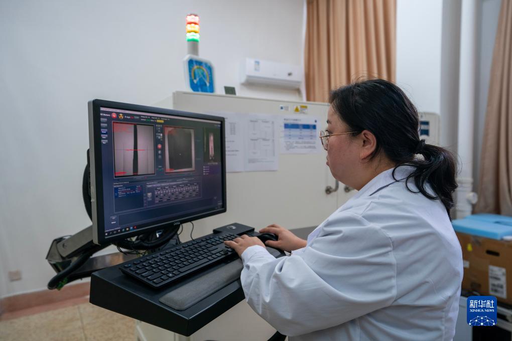 10月11日,云南大學古生物研究院“節肢動物演化研究”課題組成員麥慧娟在調整CT掃描儀參數。
