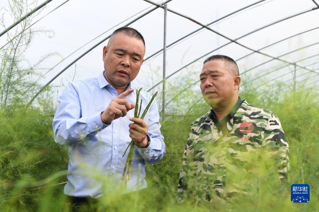 10月11日,在漣水縣紅窯鎮金城村,淮安市人大代表鄭標(左)給蘆筍種植戶傳授管護知識。鄭標是當地蘆筍種植大戶,帶領許多村民走上種植蘆筍之路。