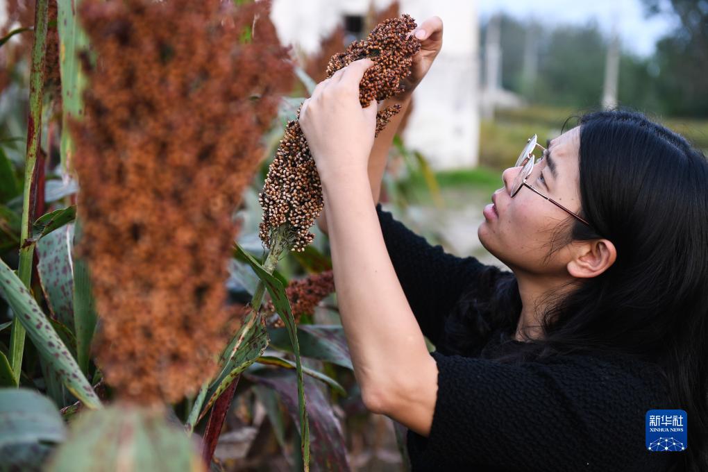 10月11日,在漣水縣五港鎮蔡工村,江蘇省人大代表、村黨總支書記、村委會主任王瑋查看高粱成熟情況。今年以來,王瑋牽頭成立合作社,規模種植高粱、辣椒、紅薯,壯大村集體經濟。