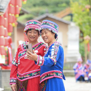 10月10日,在重慶市石柱土家族自治縣橋頭鎮的陶然居瓦屋小寨,當地村民身著民族服裝準備迎候游客到來。