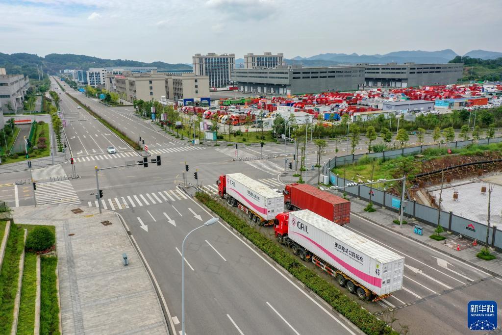 10月11日,滿載筆記本電腦配件、發電機組件等產品的西部陸海新通道跨境公路班車從重慶南彭公路保稅物流中心駛出,將途經廣西憑祥,直達越南(無人機照片)。