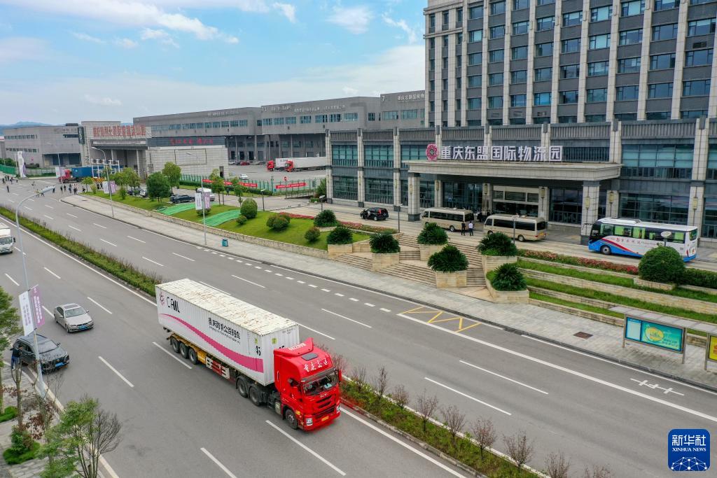 10月11日,滿載筆記本電腦配件、發電機組件等產品的西部陸海新通道跨境公路班車從重慶南彭公路保稅物流中心駛出,將途經廣西憑祥,直達越南(無人機照片)。