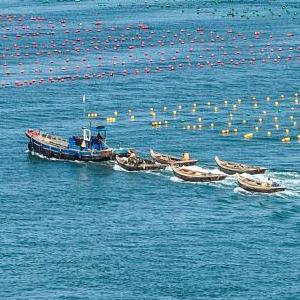 金秋時節,在山東省榮成市,各大海洋牧場海上養殖區一派繁忙景象,漁民駕駛漁船、舢板出海作業,在碧海上“繪”出一幅幅秋日漁耕圖。