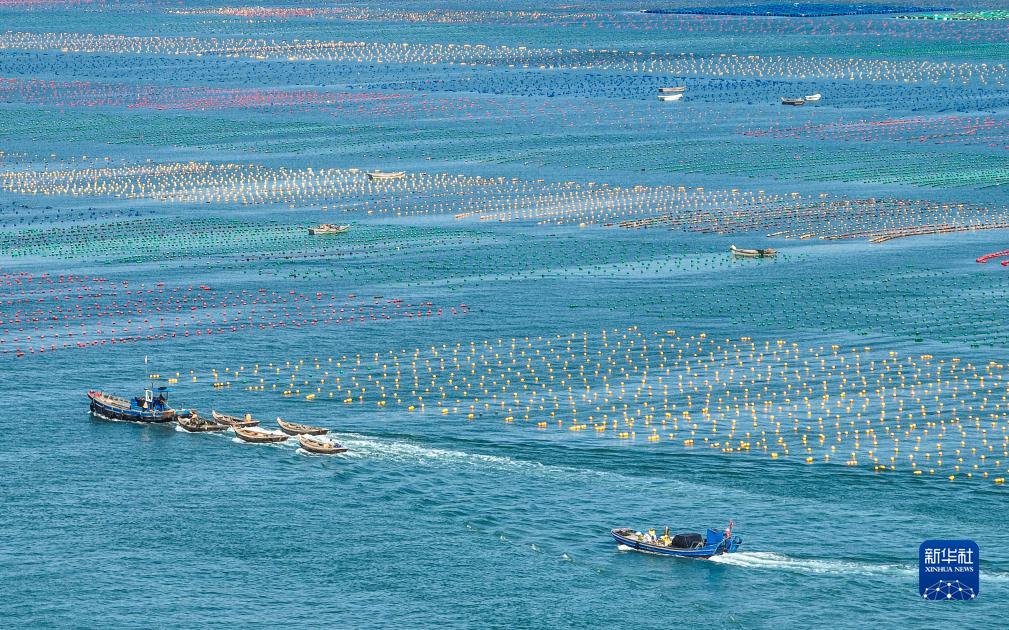 金秋時節,在山東省榮成市,各大海洋牧場海上養殖區一派繁忙景象,漁民駕駛漁船、舢板出海作業,在碧海上“繪”出一幅幅秋日漁耕圖。