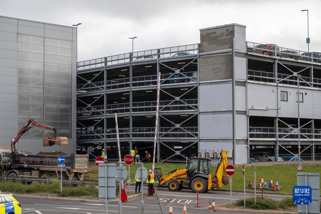 10月11日,在英國倫敦盧頓機場,工作人員在失火停車場附近工作。