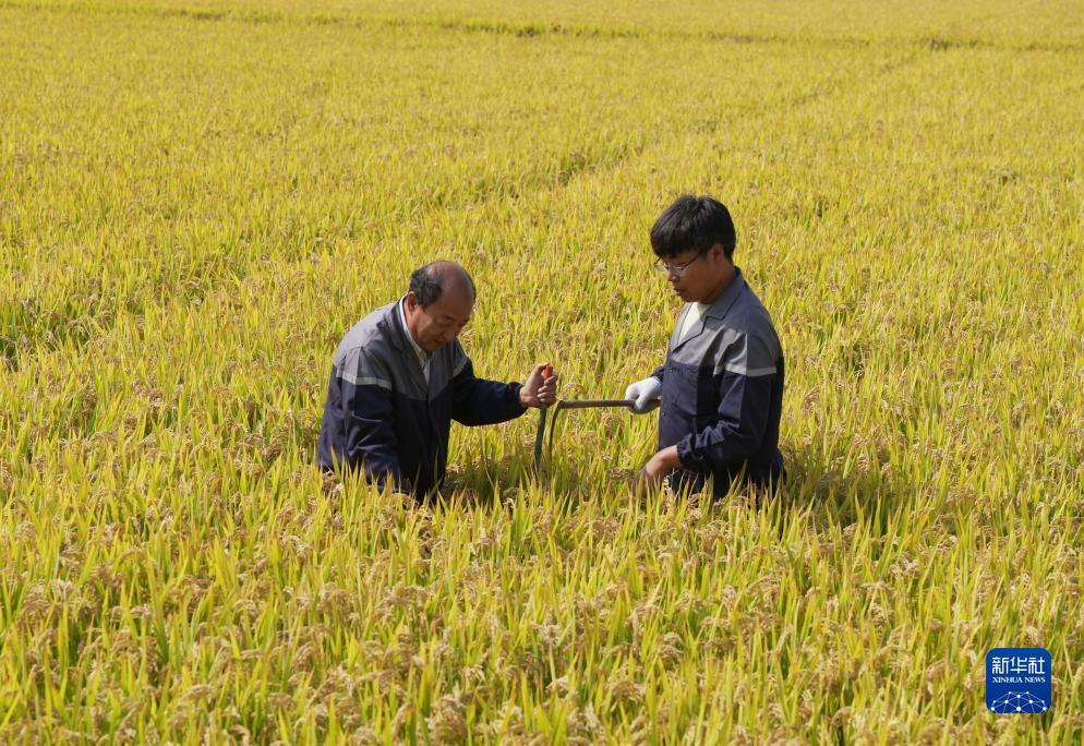 10月11日,在河北省唐山市曹妃甸區第五農場鹽堿地改良而成的高標準稻田,農業科研人員采集測產稻樣。