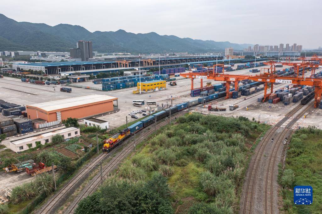 10月11日,一列滿載重質純堿、汽油機等貨物的西部陸海新通道班列,從位于重慶國際物流樞紐園區的重慶團結村中心站駛出(無人機照片)。