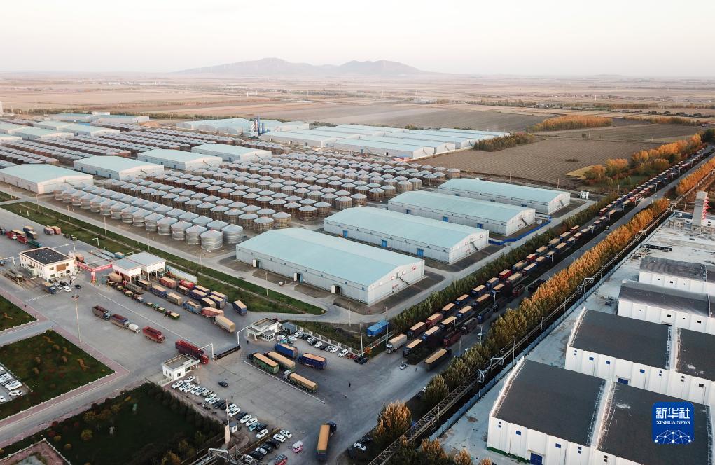 10月11日,送糧車在黑龍江省富錦市一大型糧食倉儲加工企業外排起長隊(無人機照片)。