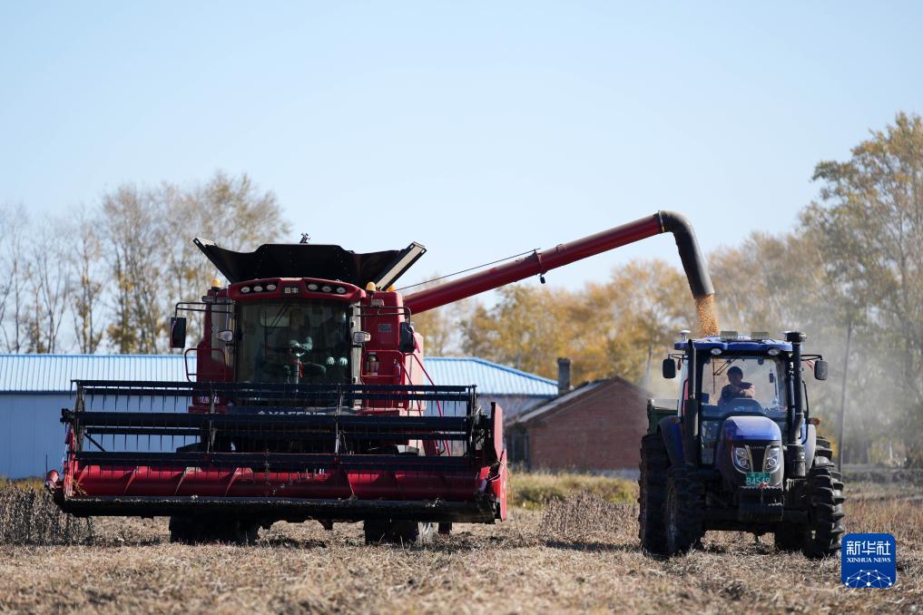 10月11日,在黑龍江省富錦市一大豆地塊的地頭,收割機卸下剛收獲的大豆。