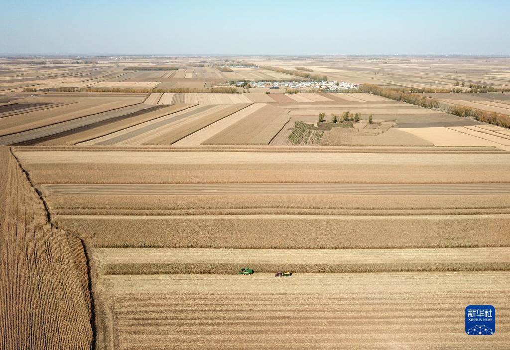 10月11日,收割機在黑龍江省富錦市一塊玉米地收獲玉米(無人機照片)。
