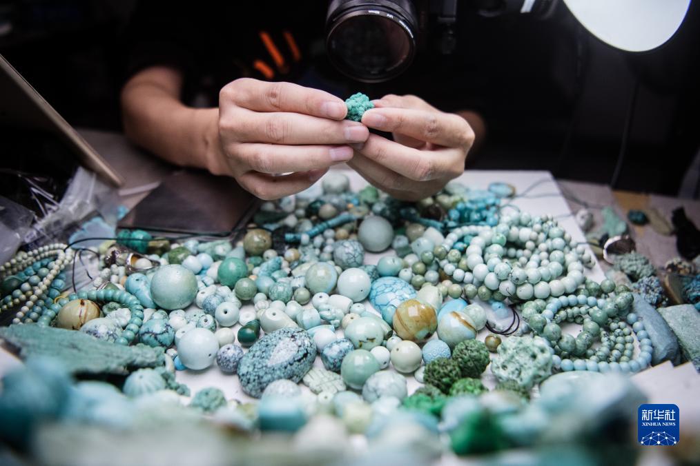 10月11日,湖北省鄖西縣下營村村民鐘磊在直播銷售綠松石制品。