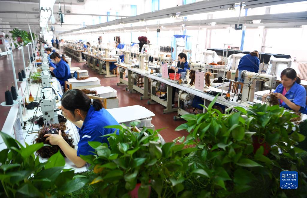10月11日,工作人員在河南瑞貝卡發制品股份有限公司的生產車間里制作假發。