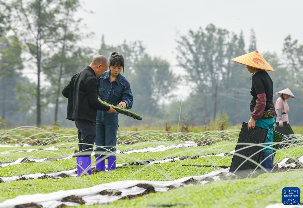 10月10日,在成都崇州市隆興鎮,王伶俐(左二)和父親王志全(左一)在查看油菜苗的培育情況。