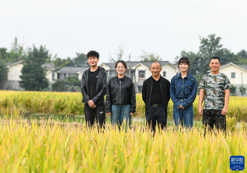 10月10日,在成都崇州市隆興鎮,王伶俐(右二)、父親王志全(右三)和楊柳土地股份合作社的青年同事在水稻田旁合影。