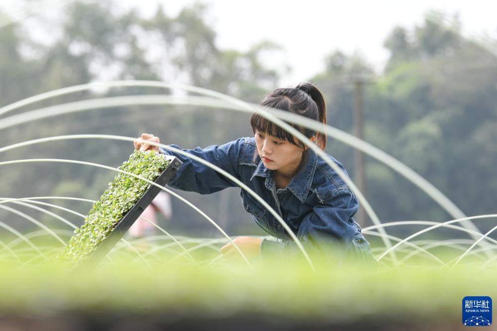 10月10日,在成都崇州市隆興鎮,王伶俐在查看油菜苗的培育情況。