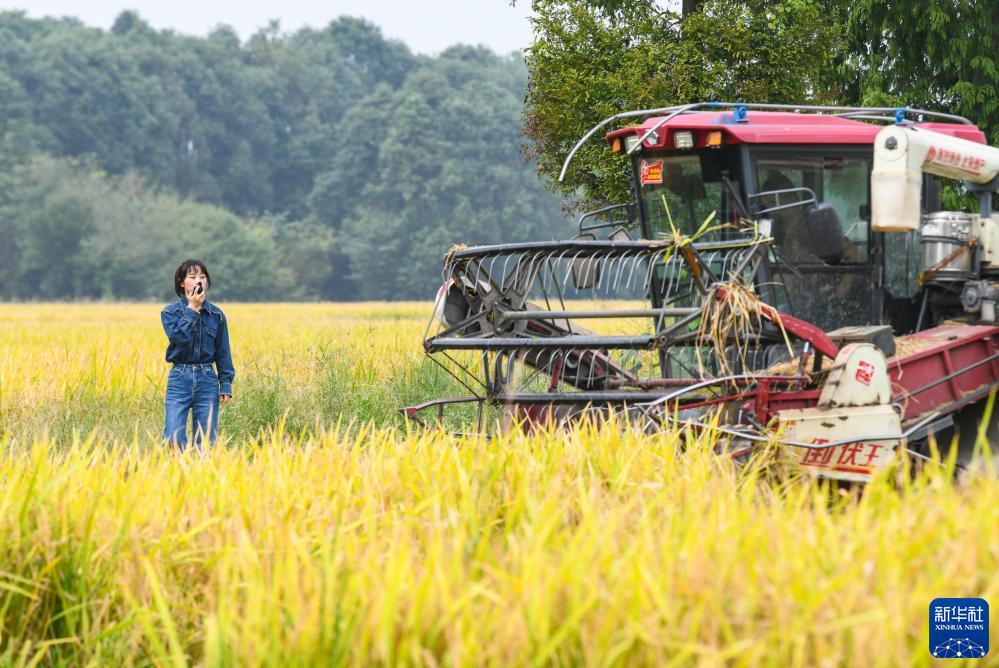 10月10日,在成都市雙流區彭鎮,王伶俐和收割機駕駛員溝通。