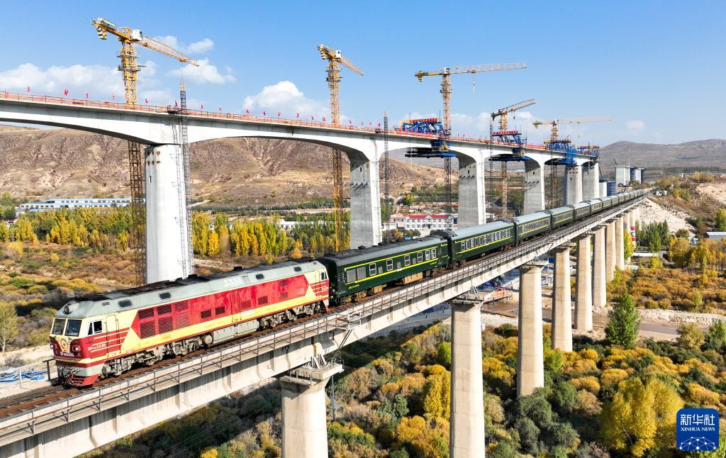 10月12日,一列客運列車在集通鐵路既有線上行駛,上方為建設中的集通鐵路電氣化改造工程多倫河特大橋剛構連續梁(無人機照片)。