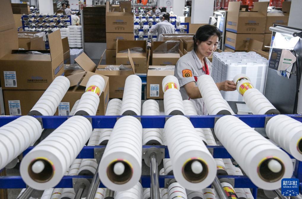 在位于重慶市涪陵區的重慶華峰新材料產業園氨綸生產車間,工作人員將制成的產品裝箱(10月10日攝)。