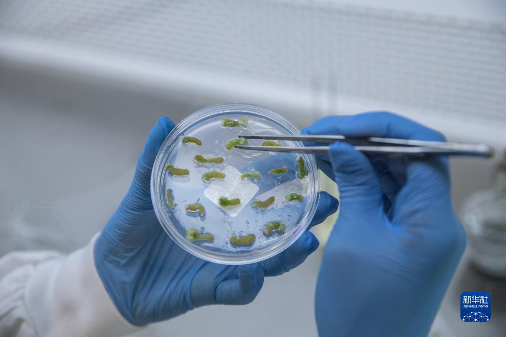 10月11日,一名科研人員在位于巴西圣保羅州克拉維紐斯的隆平巴西分子生物實驗室內查看育種繁育情況。