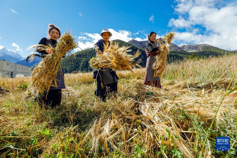 10月12日,在四川甘孜藏族自治州稻城縣亞丁村,村民澤仁拉姆、小松呷、格拉姆(從左至右)在捆扎她們收割的青稞。
