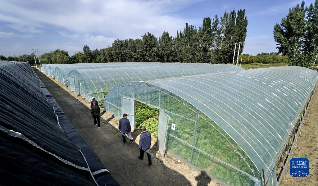 10月10日,農民在巡視“五村聯營”村共同出資在潞城營一村建設的訂單蔬菜大棚。