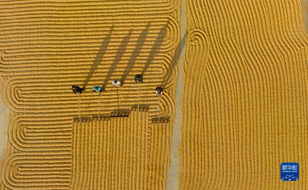 10月12日,在燈塔市禾谷茂源水稻種植專業合作社,農民在晾曬收獲的水稻(無人機照片)。