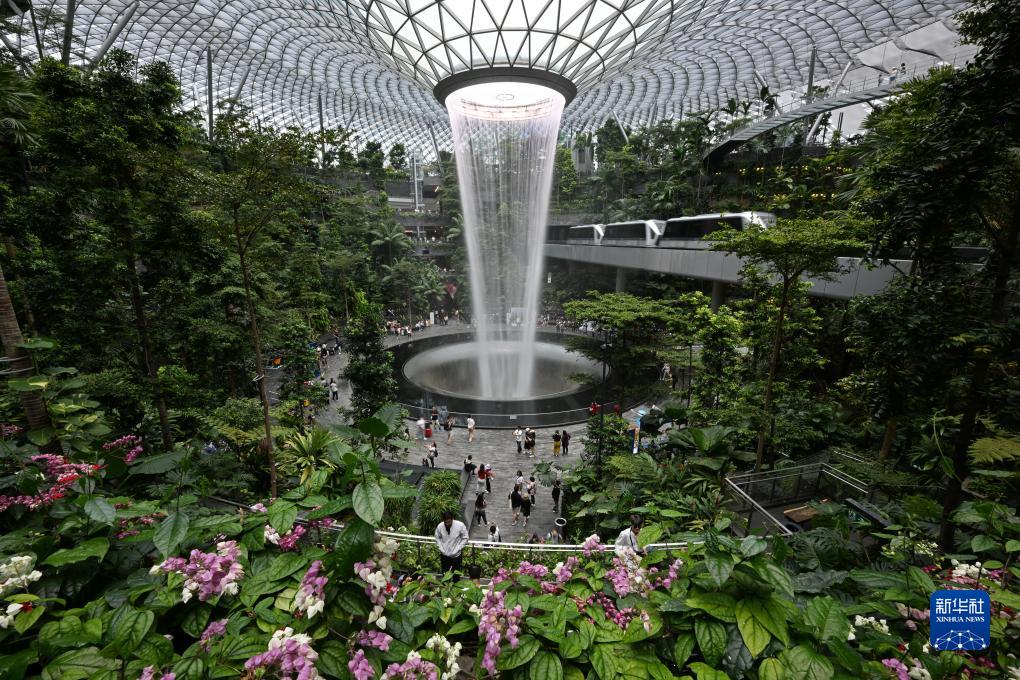 這是2023年9月7日拍攝的新加坡樟宜機場內的室內瀑布。