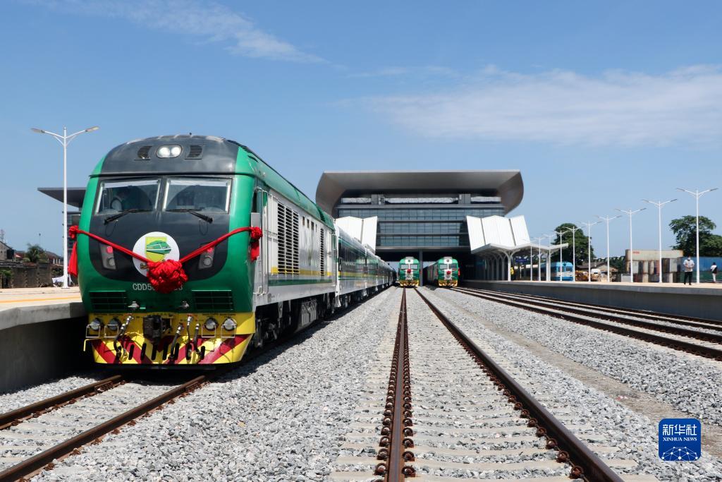 這是2021年6月10日在尼日利亞拉各斯拍攝的拉伊鐵路通車儀式上的火車。拉伊鐵路是中國土木工程集團有限公司(中土集團)承建的尼日利亞鐵路現代化項目的第二標段,連接尼日利亞經濟中心拉各斯和西南部工業重鎮伊巴丹。