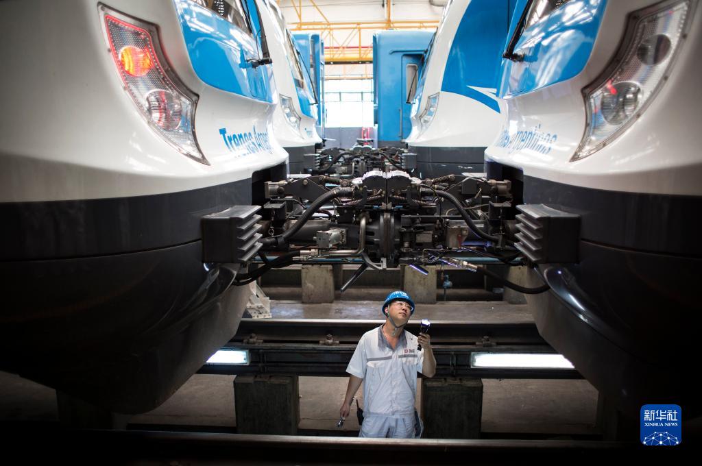 2017年4月11日,在位于阿根廷首都布宜諾斯艾利斯以南的利亞瓦略爾,中方技術人員檢查為羅卡線城際鐵路提供的列車。近年來,在阿根廷,中車制造的各種軌距、各種制式、各種型號的鐵路機車、動車組、客車、貨車和地鐵列車密集交付。