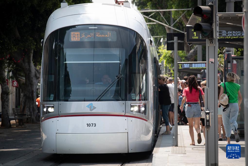2023年8月18日,在以色列城市特拉維夫,人們在輕軌紅線布盧姆菲爾德體育場站上下車。特拉維夫輕軌項目是以色列建國以來最大的政府特許基礎設施建設項目,分為紅線、綠線、紫線等線路,其中進展最快的紅線全長約24公里,連接起特拉維夫及其下轄的幾座衛星城市,沿途共設34個車站,其中24個為地面車站,10個為地下車站。