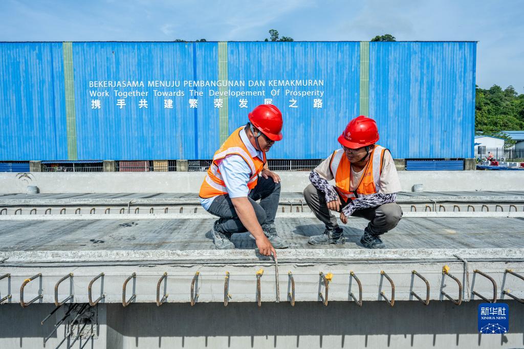 2023年4月26日,在馬來西亞吉蘭丹州的馬東鐵項目一分部制梁場,技術主管鄧友志(右)和馬來西亞本地青年員工鄧德緯討論生產情況。共建“一帶一路”倡議框架下的馬東鐵項目對促進當地經濟發展、基礎設施建設與聯通、增進民生福祉有著重要作用。