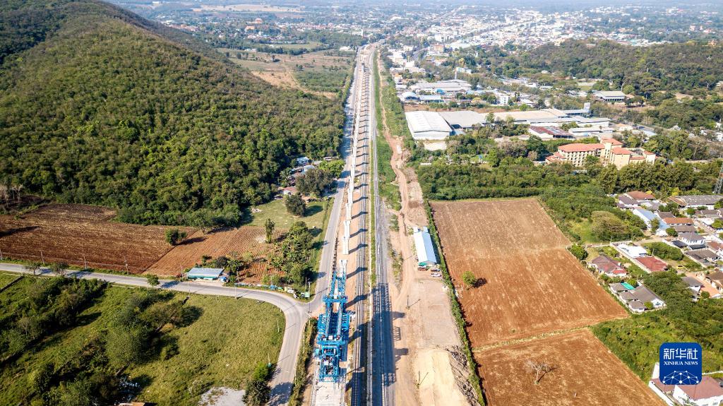 這是2023年2月23日在泰國呵叻府拍攝的中泰鐵路建設現場(無人機照片)。作為中泰共建“一帶一路”的旗艦項目及泰國首條標準軌高速鐵路,中泰鐵路采用中國標準設計建造,一期工程連接曼谷和呵叻,二期工程將實現與中老鐵路銜接,經老撾磨丁和中國磨憨可以抵達昆明。