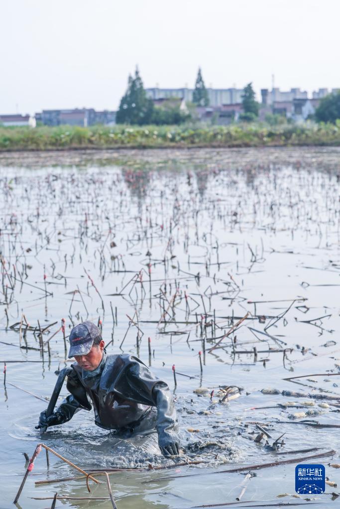 近期,浙江省湖州市吳興區東林鎮的蓮藕、菱角等水鄉特色農產品迎來豐收,農戶們趁著秋日好天氣進行采收。