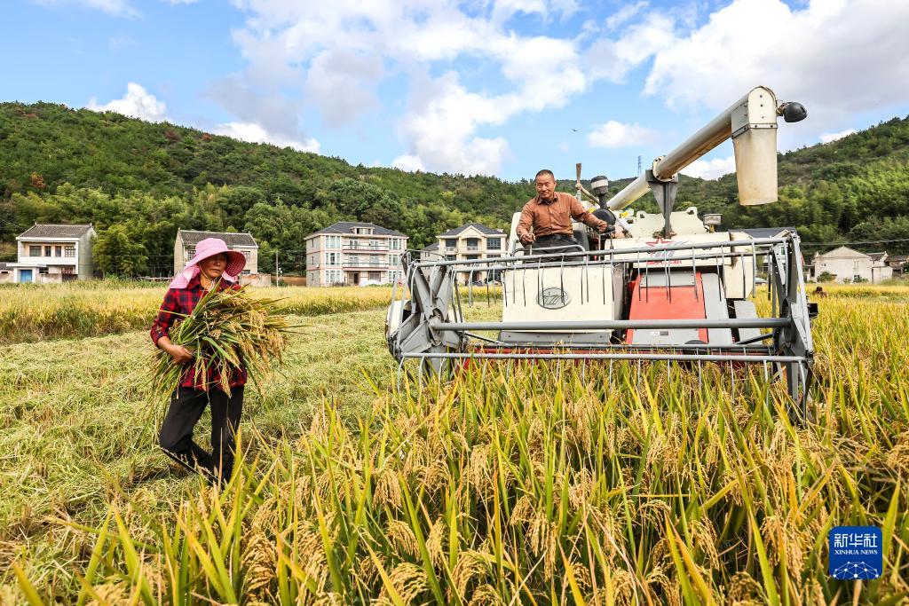 金秋時節,農民忙著收獲晾曬,豐收圖景美如畫。