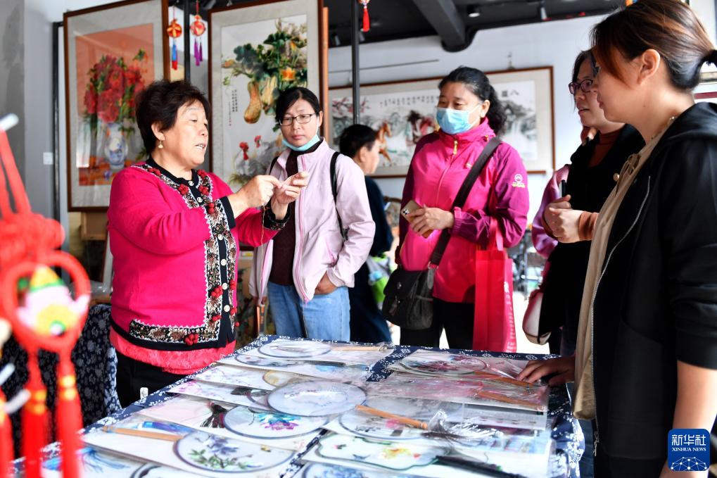 10月12日,在石家莊市鹿泉區土門關驛道小鎮,河北省級非遺傳承人邢蘭芳(左一)向游客介紹邢氏刺繡工藝。