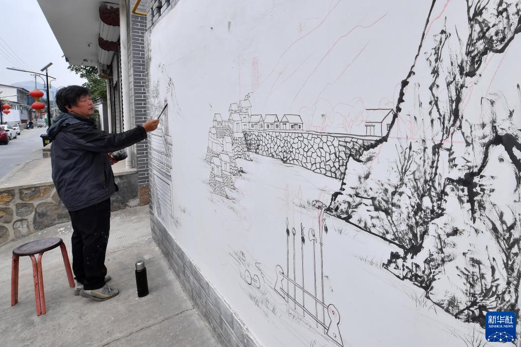 10月12日,工作人員在石家莊市鹿泉區東土門村進行墻體彩繪。