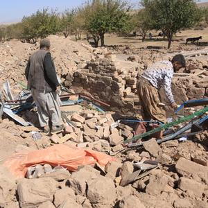 10月11日,在阿富汗西部赫拉特省津達詹區奈卜拉菲村,村民查看震后景象。