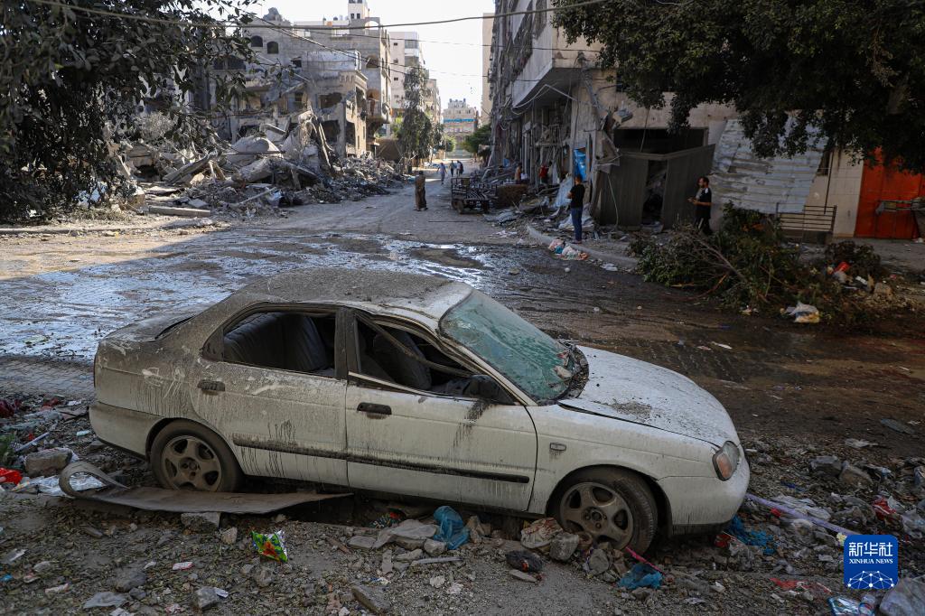 這是10月12日在加沙城拍攝的一輛被以色列軍隊空襲炸毀的汽車。