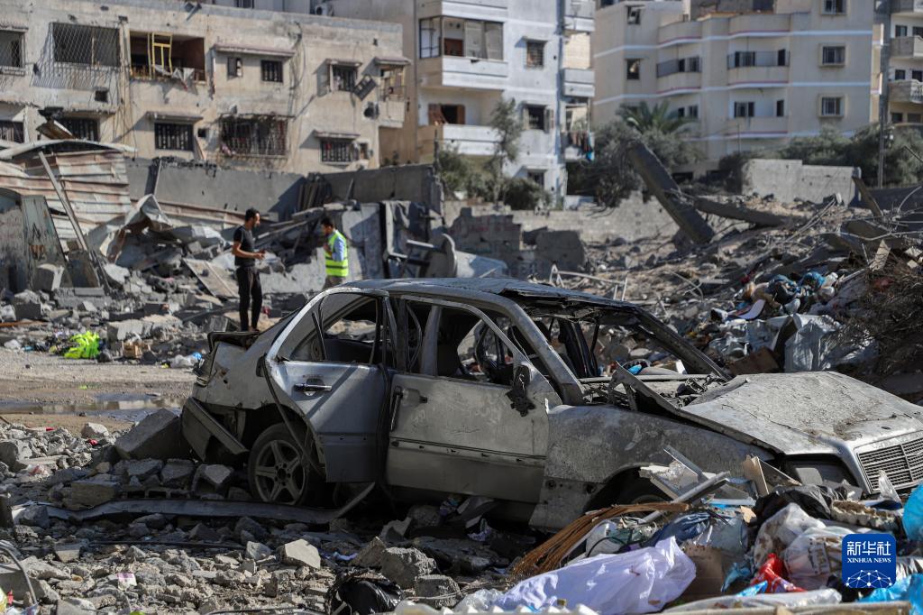 這是10月12日在加沙城拍攝的一輛被以色列軍隊空襲炸毀的汽車。