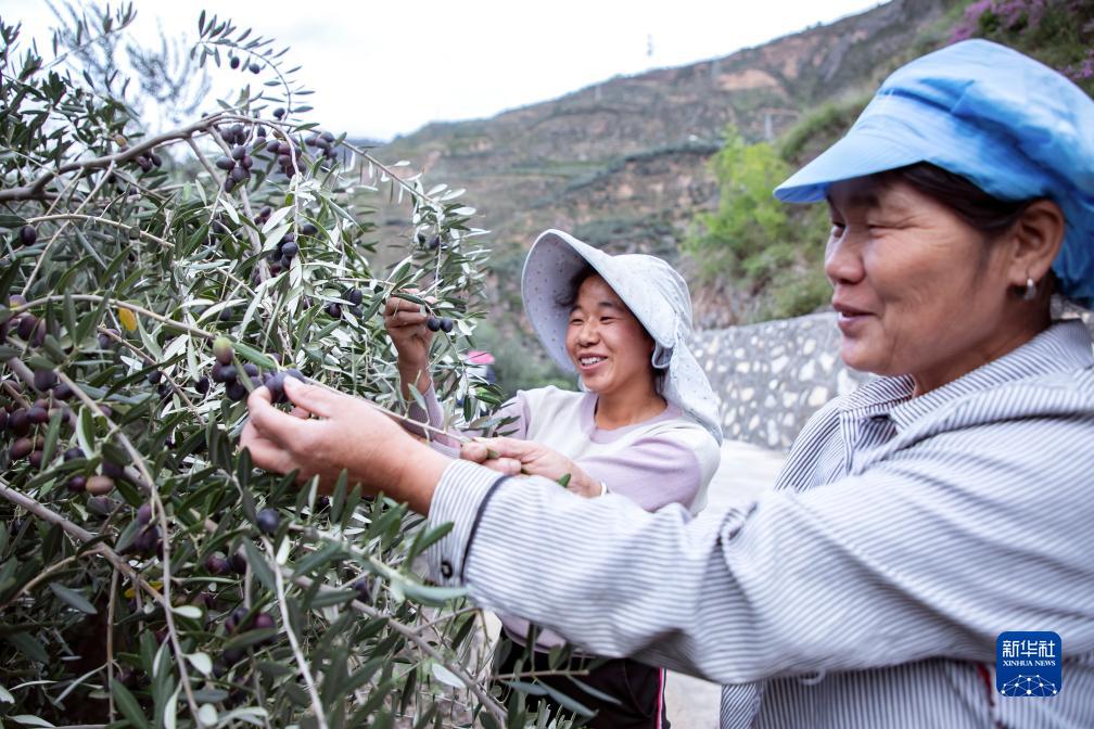 10月12日,農戶在隴南市武都區外納鎮稻畦村一處油橄欖種植基地采摘油橄欖。