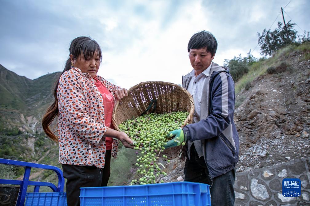 10月12日,在隴南市武都區外納鎮稻畦村一處油橄欖種植基地,農戶將采摘的油橄欖倒入收納箱。