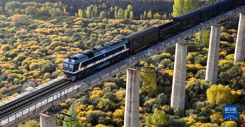 一列火車行駛在內蒙古自治區赤峰市克什克騰旗集通鐵路上(10月12日攝)。