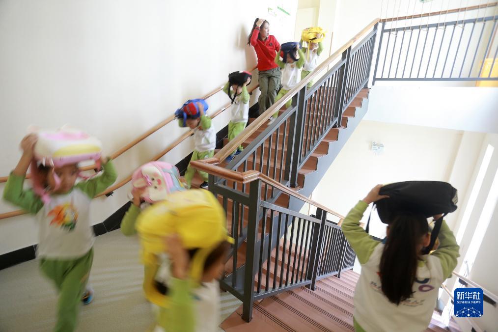 10月13日,江蘇省揚州大學附屬西郡幼兒園的老師組織小朋友進行逃生演練。