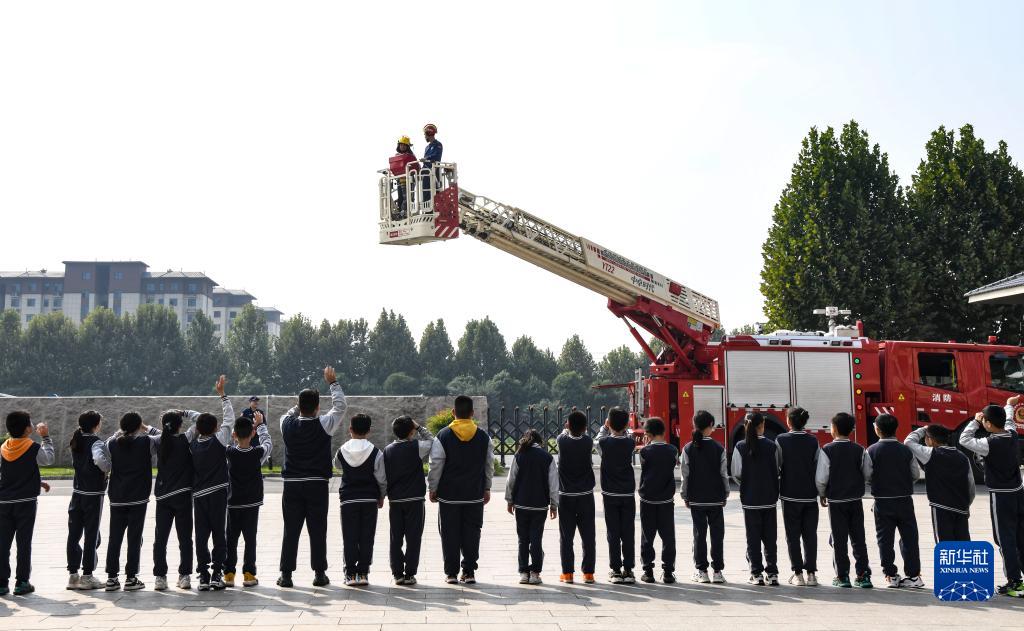 10月13日,在河南省濟源市延慶外國語學校,一名學生在消防員陪伴下乘云梯體驗高空救援。