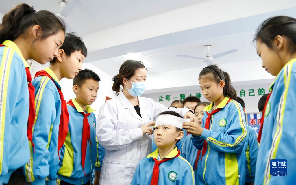 10月13日,在河北省邢臺市家樂園小學,學生在醫護人員指導下學習緊急救護知識。
