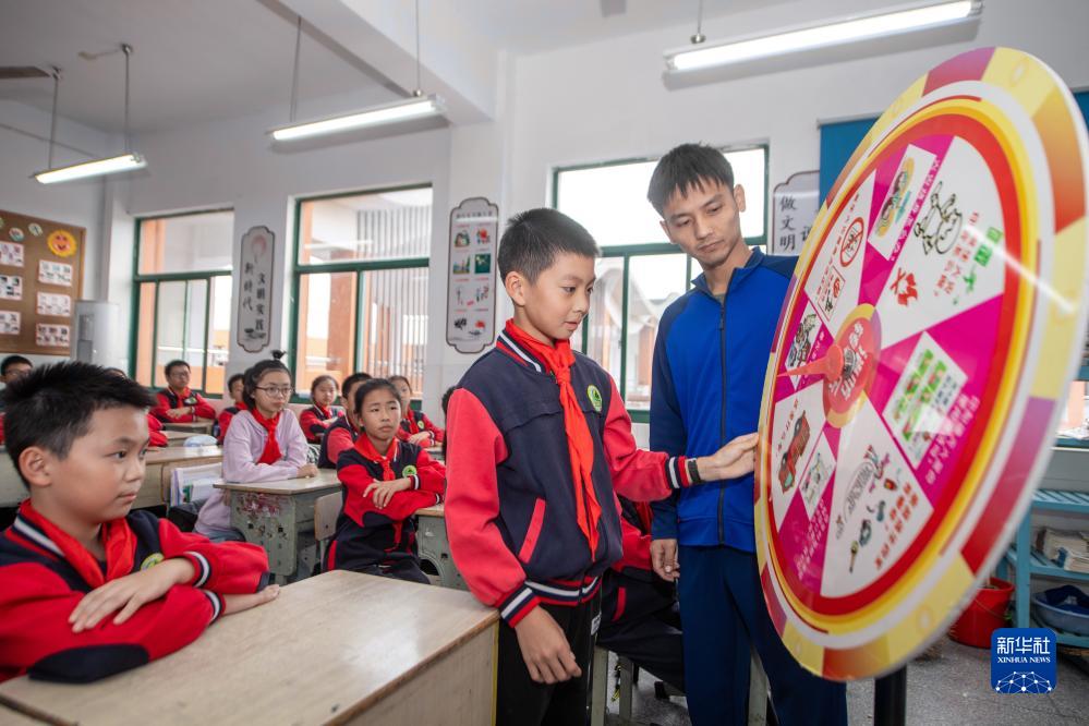 10月13日,浙江省湖州市長興縣泗安鎮中心小學學生在泗安專職消防隊的指導下參與防災減災安全知識大轉盤游戲。