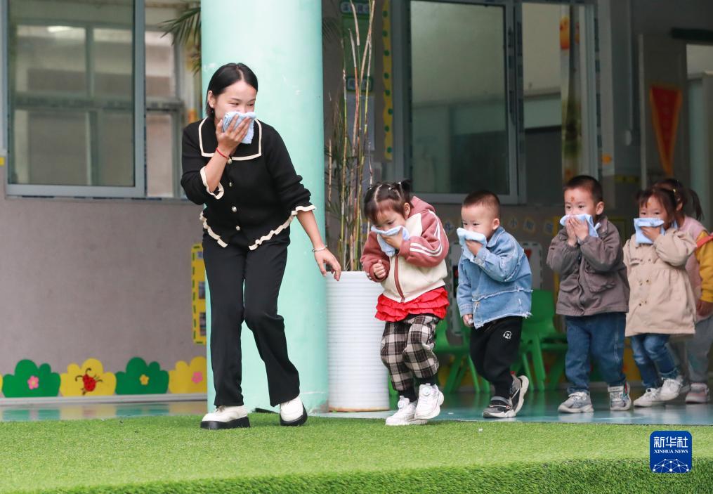 10月13日,貴州省黔東南苗族侗族自治州從江縣剛邊壯族鄉中心幼兒園的小朋友在老師的指導下進行火災應急疏散演練。