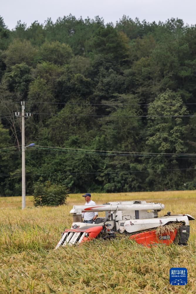 10月13日,在杭州臨安太陽鎮的杭州臨安元生糧油專業合作社生態稻田內,種植戶用收割機收割生態水稻。